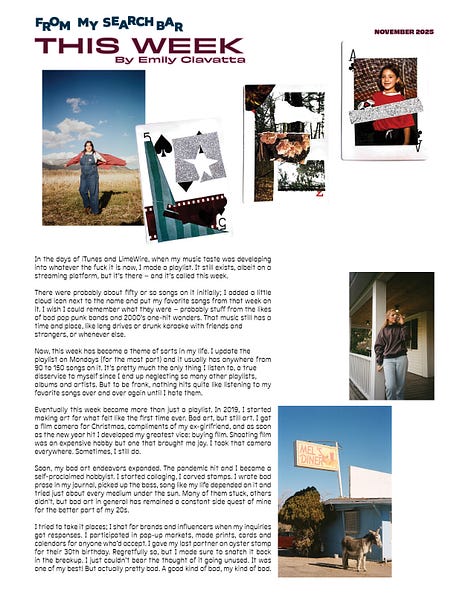Though ultimately, my bad art was just a hobby. And I was okay with that. I still wanted to put it out there, even if it was going into the ether. I made an Instagram account called this week, to no one’s surprise, where I shared most of my projects (and still do). The playlist, an endless rotation of songs I daydreamt to, had grown to become the grand theme of my art and creativity. It represented my music taste, first and foremost, but also my eagerness to make things and my undying commitment to bad art. It was an embodiment of my earnestness. Who I was, who I’d be next. I liked that it followed me from high school – a mostly forgotten time, but one that was a catalyst for becoming who I wanted to be – to now.